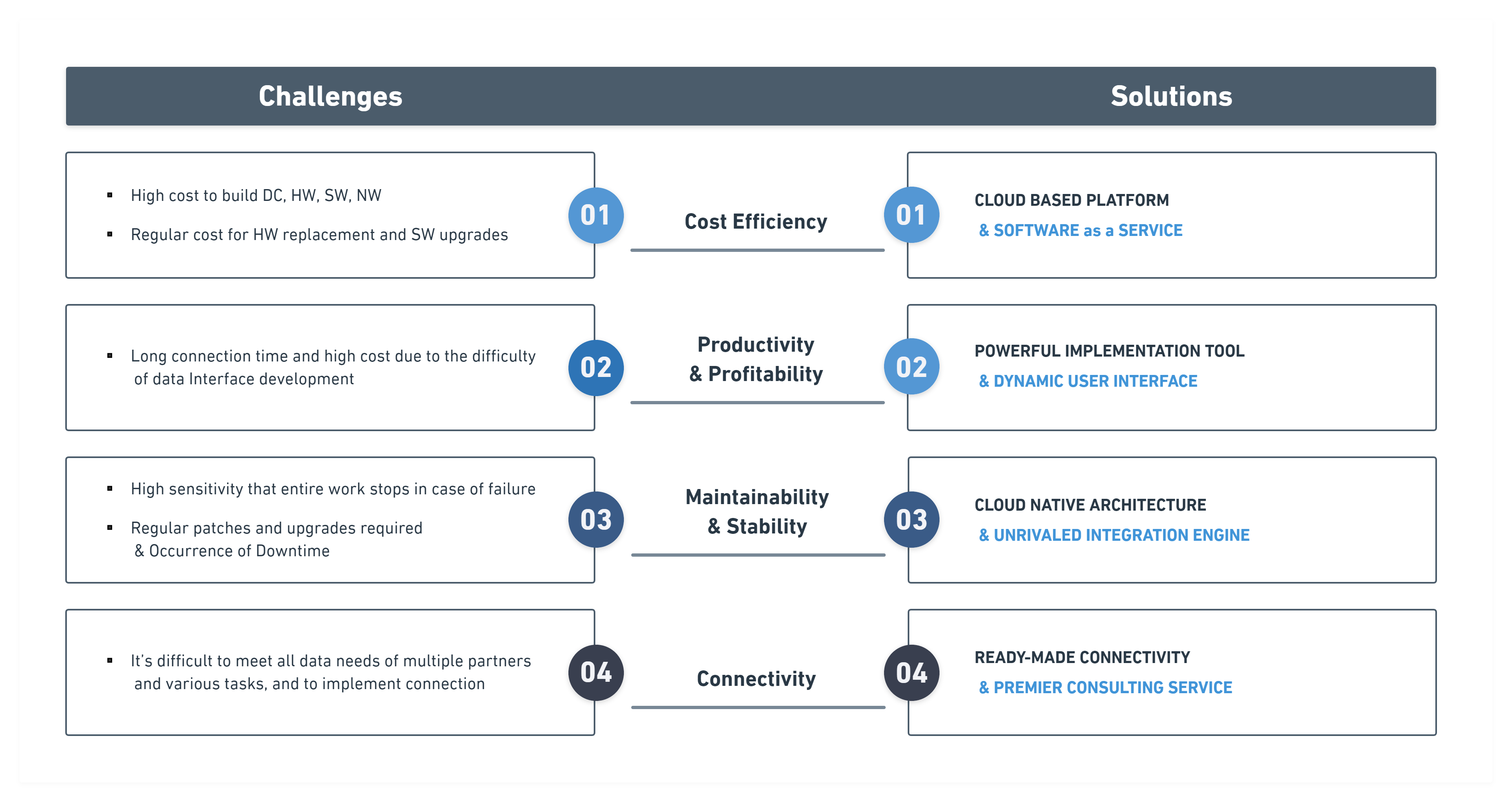 SmartLink high-performance integration engine developed by CyberLogitec. Even when handling bulk data communication with multiple partners simultaneously, it provides high-quality performance for accurate processing in a short time.